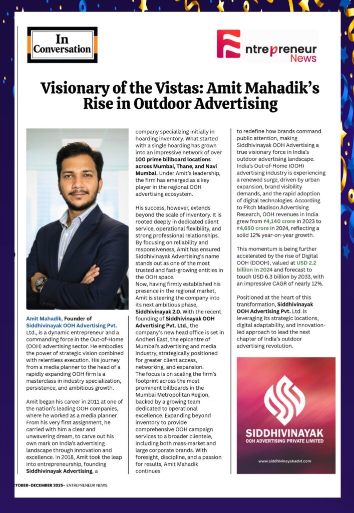 As the driving force behind Siddhivinayak Advertising, the Founder & CMD leads the company’s vision, strategy and growth. With a decade of market expertise, they build client trust, forge key partnerships and steer the team toward delivering impactful outdoor campaigns.